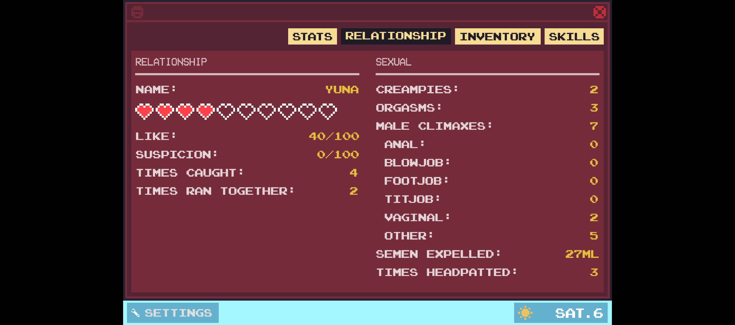 And one thing you could add to the game: it would be nice if, when the player uses lubricant before anal sex, the wakefulness bar took longer to fill.