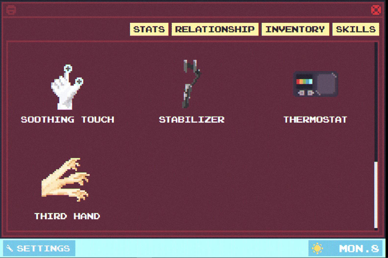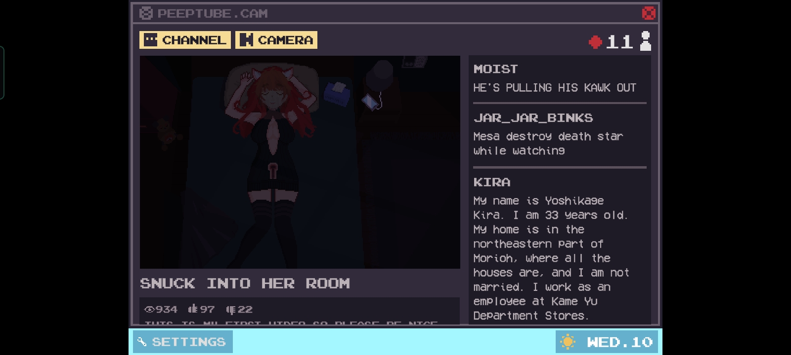 there's some bugs in V0.4.3.5, relationship is stuck in 20 (not growing, if you modify the save file, for one day you get bigger relationship, but the next day is still 20), "cook for her" if you click any item the picture is freezing on the screen and only disappearing if you restart the game